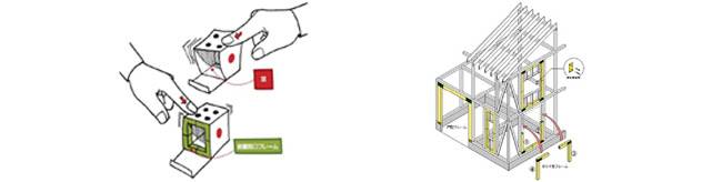 木造軸組内に嵌め込む唯一のフレームで、筋交い、構造用面材に代わって窓・開口部が耐力壁になります。いわゆるラーメンフレームとは異なり、一般の木造軸組(在来・金物)工法に必要な本数を設置して構造を成立することができます。